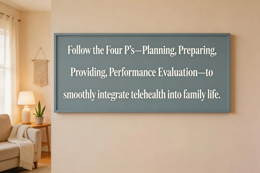 The “Four P’s” framework—Planning, Preparing, Providing, and Performance Evaluation—guides a smooth rollout: plan technology and scheduling, prepare the family’s space and consent, provide secure sessions, and evaluate outcomes regularly.