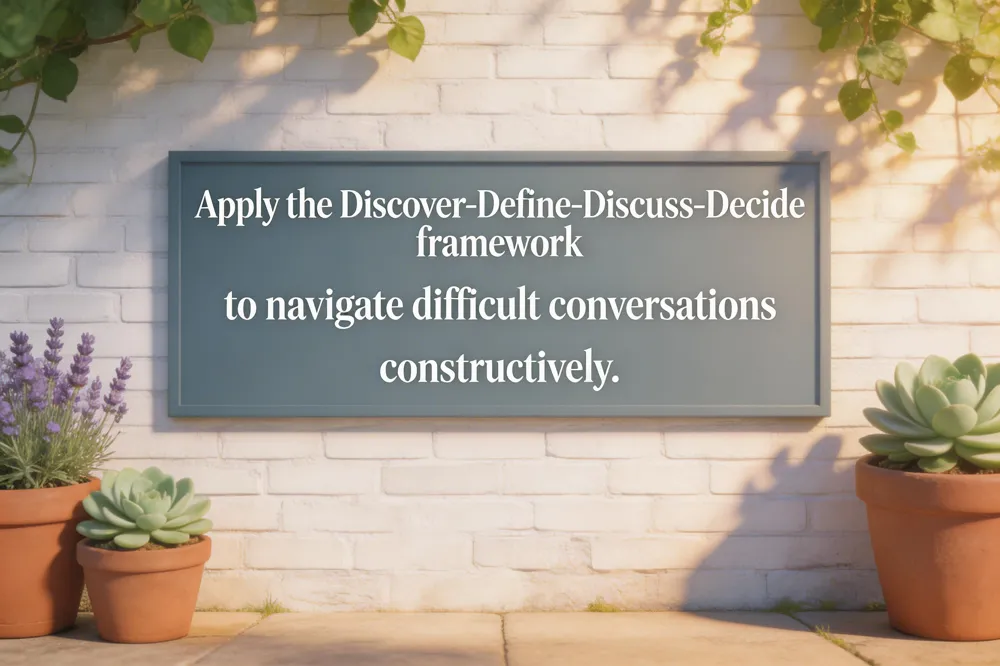 When a conversation feels charged, the Discover–Define–Discuss–Decide framework provides a roadmap that keeps both partners from slipping into blame or escalation.