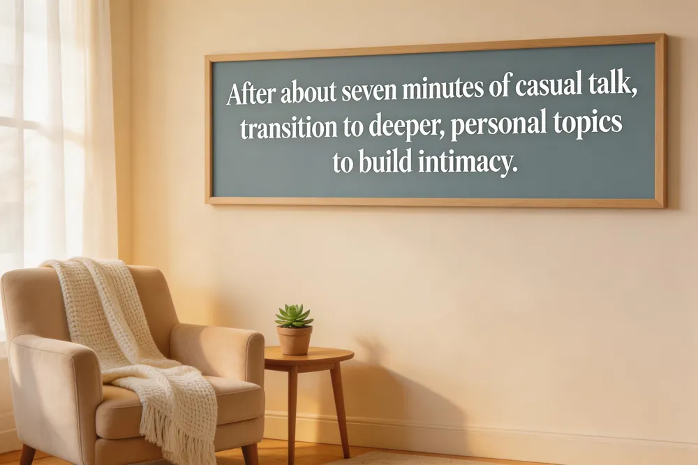Timing cues for transitioning – Pay attention to subtle signals around the seven‑minute mark: relaxed body posture, sustained eye contact, and a willingness to ask open‑ended questions. When you notice these cues, gently steer the dialogue toward a curiosity‑driven prompt (e.g., “What experience has shaped your outlook on life?”) or share a brief, authentic anecdote of your own. This “conversation swapping” balances self‑disclosure with inquiry, keeping the exchange reciprocal and low‑pressure.