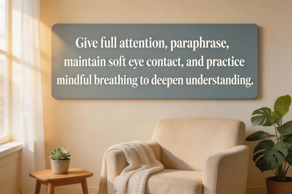 Eye contact, body language, and mindfulness complete the listening loop. Maintain soft eye contact, keep an open posture, and nod occasionally to convey presence. Mindful breathing during the conversation keeps you grounded and lowers cortisol, enhancing emotional attunement.