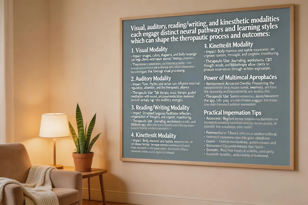 Understanding a client’s preferred learning style—visual, auditory, or kinesthetic—helps therapists deliver information in a way that reduces cognitive load and boosts retention. Research shows that aligning instruction with sensory modality improves comprehension, while multimodal approaches that blend images, spoken explanations, and hands‑on activities enhance neuroplasticity and treatment outcomes. Evidence‑based therapies such as CBT, ACT, and ABA can be personalized by incorporating visual charts, audio recordings, or movement‑based exercises, maintaining fidelity while meeting individual preferences. This client‑centered, multimodal delivery supports engagement, fosters self‑advocacy, and ultimately leads to more effective mental‑health care for diverse populations and promotes long‑term recovery and wellbeing today.