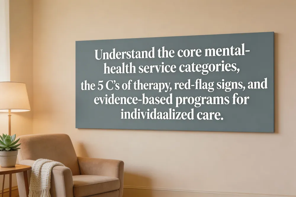 Understanding the four core categories of mental‑health services—cognitive, behavioral, humanistic, and integrative/holistic—helps clients see how therapy can be matched to their needs. The 5 C’s of therapy—Clarity, Connection, Coping, Control, and Compassion—guide sessions toward clear insight, supportive relationships, healthy stress management, personal agency, and self‑kindness.