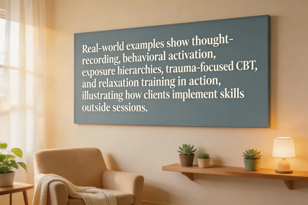 Thought‑record and behavioral activation examples: A client keeps a seven‑column thought‑record after a stressful meeting, noting the automatic thought “I’m a failure,” gathering contradictory evidence, and writing a balanced alternative such as “I did my best and received positive feedback.” Behavioral activation(https://pmc.ncbi.nlm.nih.gov/articles/PMC8489050/) may involve scheduling activities—like a walk, a hobby, and coffee with a friend—to counter depressive inertia and boost mood.