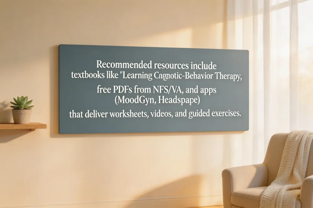- Cognitive Behavioral Therapy (CBT) links thoughts, feelings, and behaviors.: Provides downloadable workbooks with ABC model, SMART goals, thought‑challenging worksheets, and activation plans.