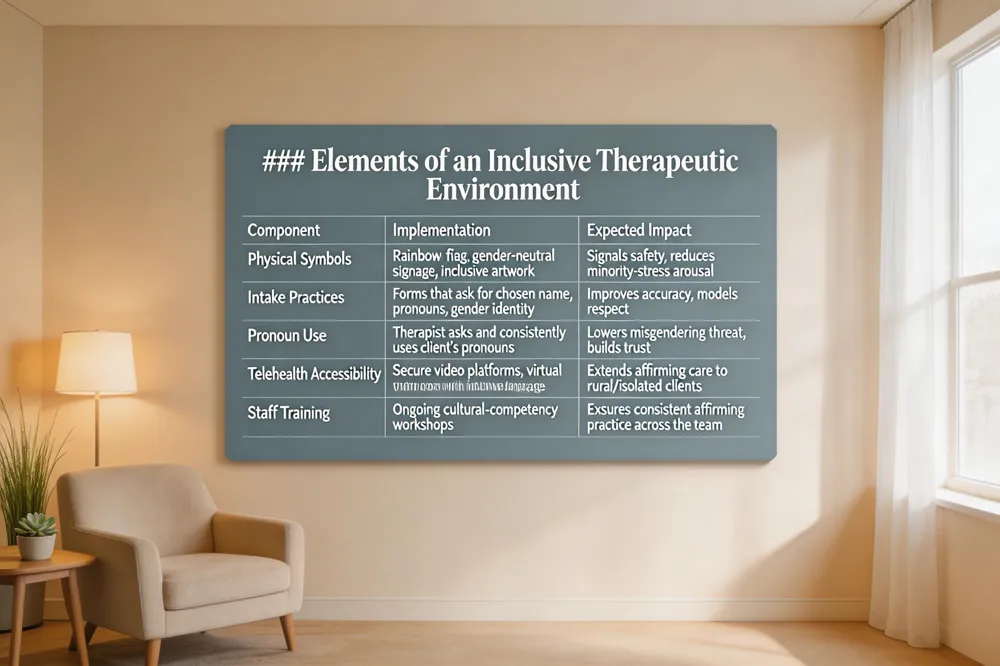 | Therapeutic spaces that are LGBTQ+‑friendly signal safety through both physical cues and clinical practices. Visible symbols—rainbow flags, gender‑neutral signage, inclusive intake forms, and gender‑neutral restrooms—communicate that the office welcomes diverse identities. Therapists consistently ask for and use each client’s chosen name and pronouns, modeling respect and reducing the threat of misgendering. This simple affirmation lowers minority‑stress arousal and fosters trust, allowing clients to explore identity, relationships, and trauma without fear of judgment. Flexible telehealth options extend these affirming conditions to clients who cannot attend in‑person sessions, especially in rural areas or where local providers lack LGBTQ+ expertise. Secure video platforms, virtual waiting rooms with inclusive language, and digital intake that capture pronouns ensure continuity of care. Together, inclusive décor, pronoun affirmation, and accessible telehealth create a non‑judgmental, trauma‑informed environment that supports self‑acceptance, reduces anxiety and depression, and promotes overall mental‑well‑being for LGBTQ+ individuals. |