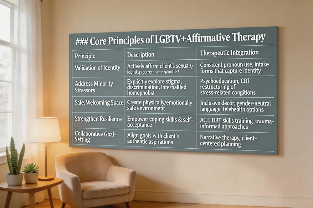 | Affirmative therapy actively validates LGBTQ+ clients’ sexual and gender identities while explicitly addressing the minority‑stressors—such as stigma, discrimination, and internalized homophobia that contribute to anxiety, depression, and other mental‑health concerns. By creating a safe, welcoming therapeutic space and using the client’s preferred pronouns and terminology, the therapist models acceptance and helps the client develop a positive self‑schema. The approach can be woven into evidence‑based modalities like cognitive‑behavioral therapy, dialectical‑behavioral therapy, acceptance and commitment therapy, or trauma‑informed interventions, targeting mechanisms such as hypervigilance, shame, and emotion‑dysregulation. Research shows LGBTQ‑affirmative psychotherapy reduces depressive and anxiety symptoms, improves coping, and lowers suicide risk across diverse sexual and gender‑minority populations. Ultimately, the goal is to empower clients to live authentically, strengthen resilience, and foster overall well‑being. |