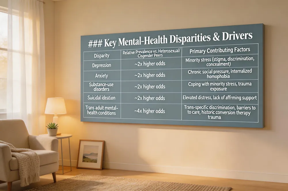 LGBTQ+ individuals in the United States face mental‑health disparities that are roughly twice as high as those of heterosexual and cisgender peers, with depression, anxiety, substance‑use disorders, and suicidal ideation markedly elevated (NAMI, Trevor Project). Minority stress theory explains that chronic stigma, discrimination, and the need to conceal one’s identity create a toxic stress environment that fuels these disparities. Research consistently shows that affirming therapeutic approaches—such as using correct pronouns, gender‑neutral intake forms, and trauma‑informed, LGBTQ‑affirmative techniques—significantly reduce anxiety, depression, and suicide risk (APA, Trevor Project). Creating a safe, authentic therapeutic space not only validates clients’ identities but also fosters resilience, self‑acceptance, and better overall mental‑health outcomes.