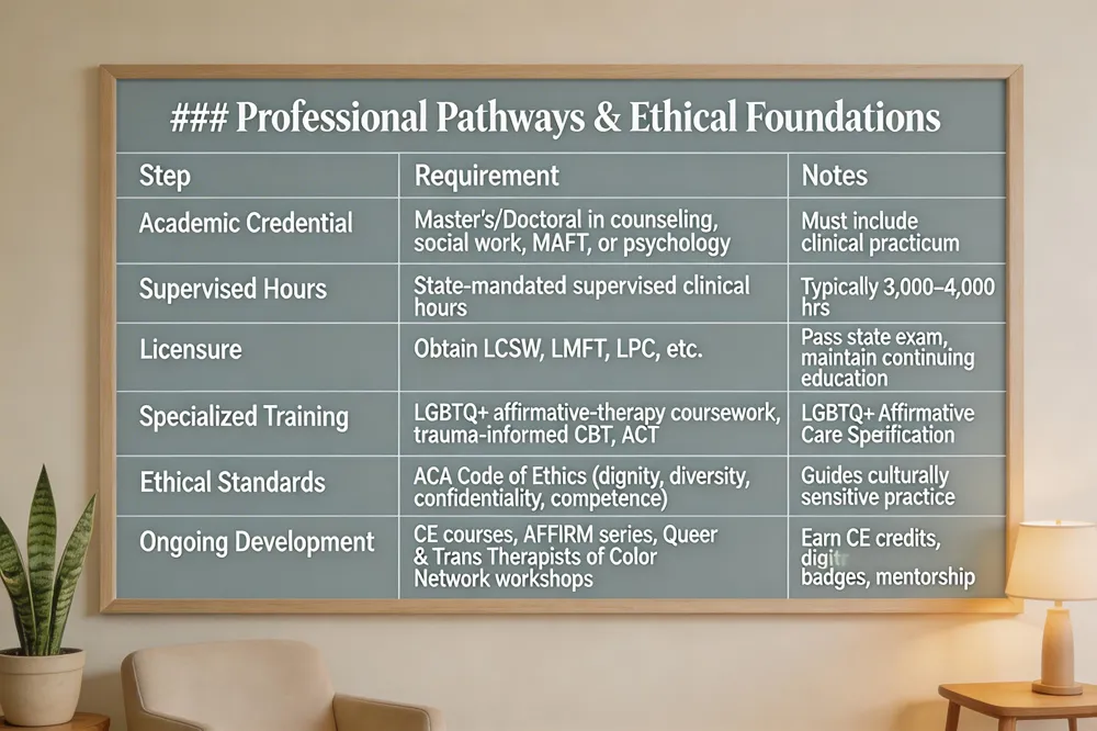 | To become an LGBTQ+ therapist, earn a master’s or doctoral degree in counseling, social work, marriage‑and‑family therapy, or psychology, complete state‑required supervised hours, obtain licensure (LCSW, LMFT, LPC, etc.) and pursue specialized affirmative‑therapy training—e.g., trauma‑informed CBT, ACT, or the LGBTQ+ Affirmative Care Specialist credential. The ACA Code of Ethics sets standards for dignity, diversity, social justice, confidentiality, and competence, guiding counselors to practice ethically and culturally sensitive. Training opportunities include the AFFIRM series, Queer & Trans Therapists of Color Network workshops, and university CE courses offering CE credits, digital badges, and mentorship. Qualified LGBTQ+ therapists hold a current license, have completed affirmative‑therapy education, engage in ongoing cultural‑competency development, and consistently use correct pronouns and inclusive language. Cultural competence means understanding and respecting clients’ diverse identities, while cultural awareness involves actively recognizing those identities throughout therapy to foster trust and effective treatment. |