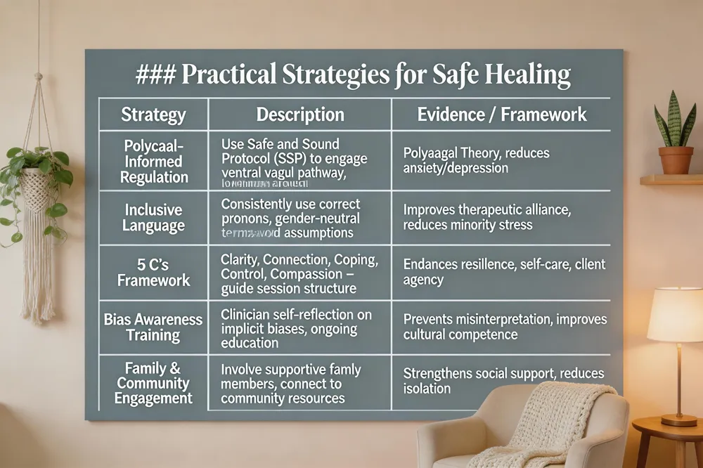| Polyvagal theory shows how the nervous system gauges safety; when the ventral vagal pathway is active, clients feel connected and can process emotions. The Safe and Sound Protocol (SSP), an auditory intervention rooted in this theory, helps regulate autonomic tone, lowering anxiety and depression in LGBTQ+ clients. Inclusive language—using correct pronouns, gender‑neutral terms, and avoiding assumptions—paired with bias awareness creates a climate where clients feel respected. The 5 C’s framework (Clarity, Connection, Coping, Control, Compassion) guides clinicians to foster communication, relationships, coping skills, client agency, and self‑care. |