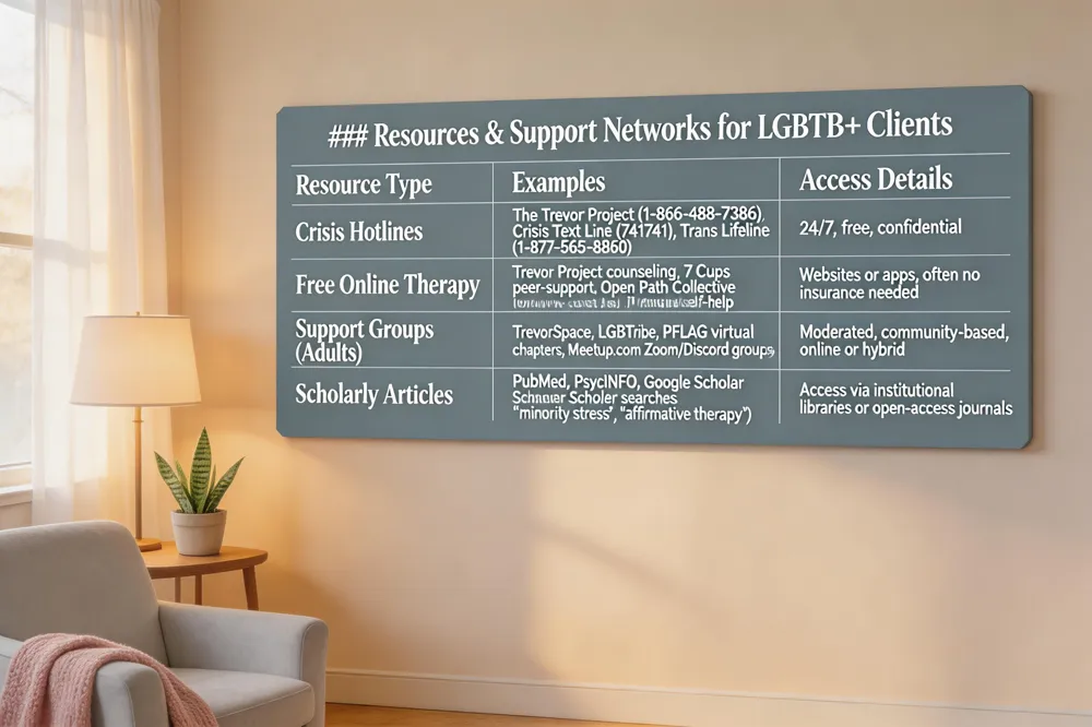 LGBTQ+ mental‑health scholarly articles – Search PubMed, PsycINFO, or Google Scholar with keywords such as “minority stress” and “affirmative therapy.” Recent systematic reviews (2024 Clinical Psychology Review, 2021 integrated literature review) offer comprehensive reference lists for evidence‑based practice.