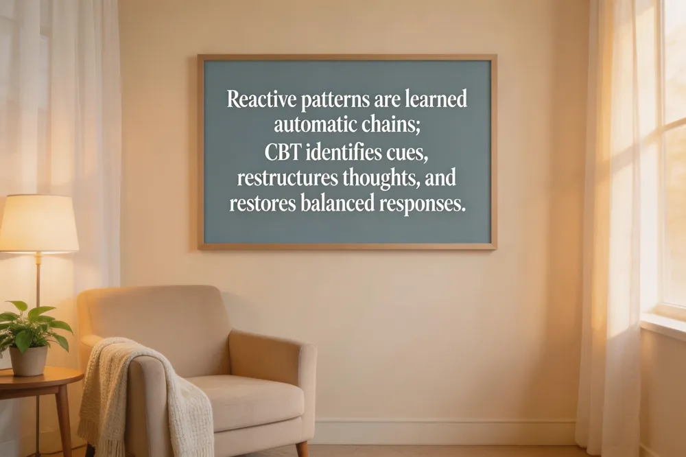 A reactive pattern is a learned chain of automatic thoughts, emotions, and bodily responses that erupts when a person perceives a threat or overwhelm. CBT teaches that these patterns develop as protective mechanisms after intense past experiences and become ingrained habits—e.g., “I must avoid pain, I can’t be vulnerable.” Without awareness, they repeat even in harmless situations, limiting mindful action Cognitive Connection, 2023.