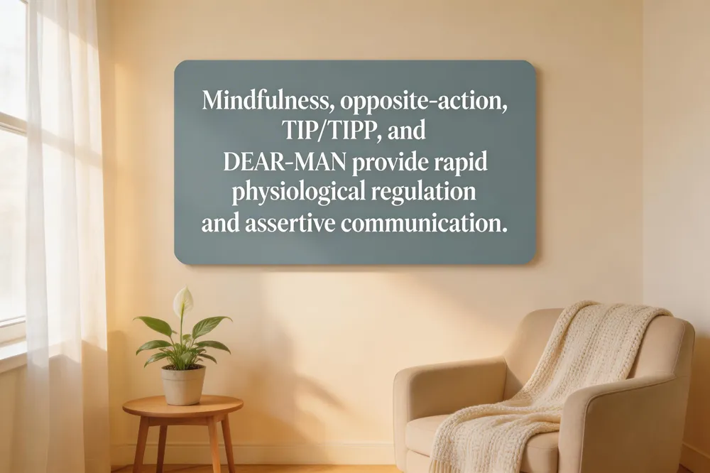 DEAR‑MAN assertive communication – This structured format (Describe, Express, Assert, Reinforce, Mindful, Appear confident, Negotiate) equips you to voice needs and boundaries clearly and respectfully, reducing the likelihood of escalation.
