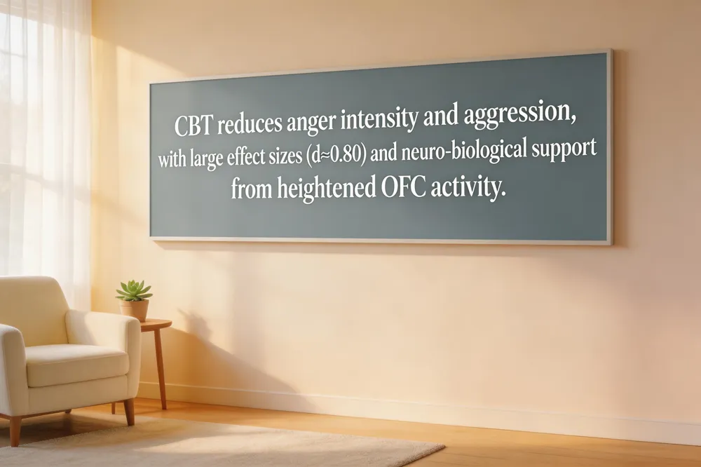 Meta‑analyses and clinical trials consistently show that Cognitive‑Behavioral Therapy (CBT) reduces anger intensity, frequency, and aggression. Large‑scale U.S. studies report 20‑30 % lower aggression scores after 8‑12 weeks of CBT, and a 2020 meta‑analysis of 34 randomized trials found a large effect size (d ≈ 0.80) for anger reduction across adult and adolescent samples. Neuro‑biologically, cognitive restructuring—core to CBT—appears to strengthen the brain’s “brake” circuitry. Functional imaging studies link the technique to increased activation in the orbital frontal cortex, which helps regulate the amygdala‑driven threat response and lowers physiological arousal during anger spikes. The American Psychological Association (APA) endorses CBT as a first‑line, evidence‑based treatment for anger‑related disorders, including intermittent explosive disorder and chronic irritability, reflecting its nationwide acceptance and insurance coverage.