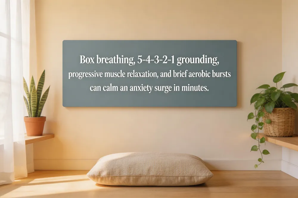Box (square) breathing, grounding (5‑4‑3‑2‑1 grounding), Progressive muscle relaxation and brief aerobic activity are evidence‑based tools that can calm a surge of anxiety in minutes.
