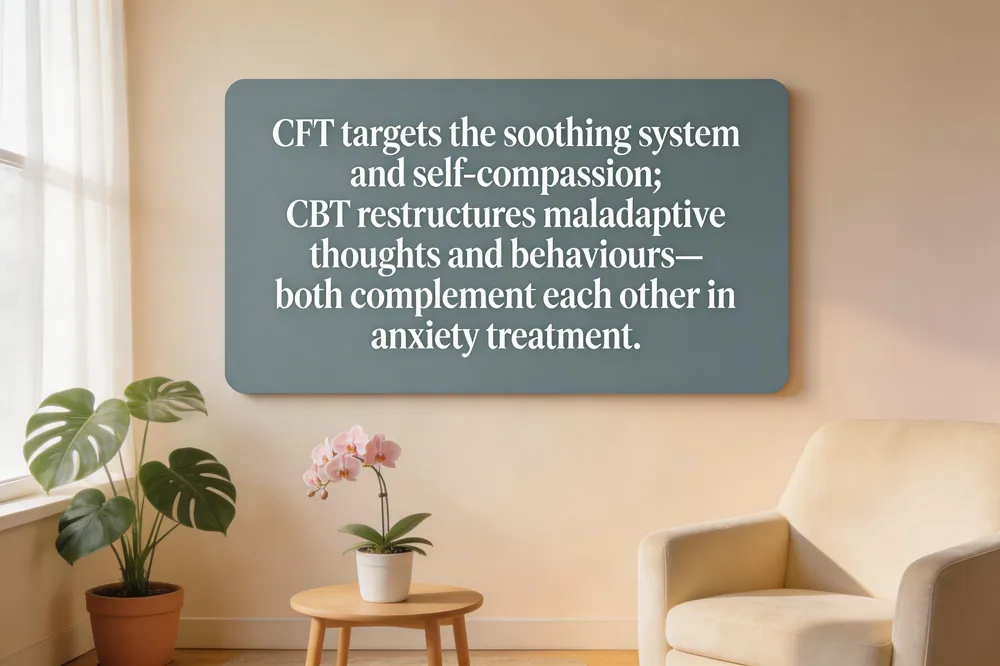 How is CFT different from CBT? CFT differs by focusing on emotional regulation and self‑compassion rather than only on thoughts and behaviours.
