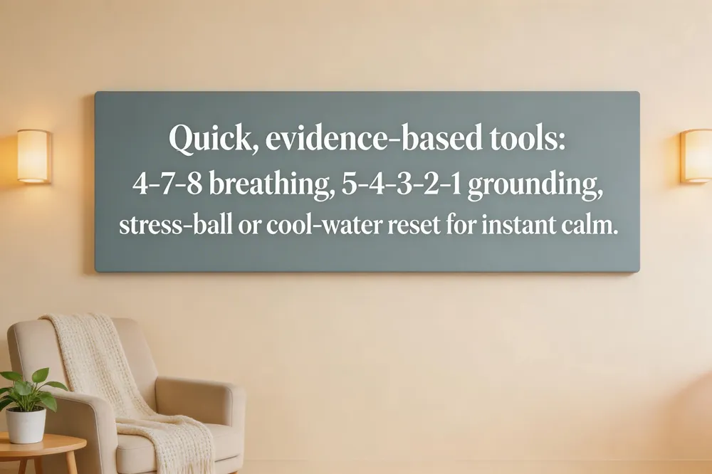 Grounding and breathing exercises – Simple practices such as 4‑7‑8 breathing, diaphragmatic breathing, and the 5‑4‑3‑2‑1 sensory grounding calm the parasympathetic system and interrupt racing thoughts.