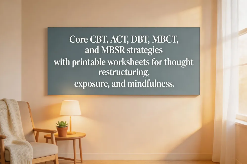 ACT, DBT, MBCT, MBSR – Acceptance and Commitment Therapy teaches clients to observe thoughts without judgment, while Dialectical Behavior Therapy adds distress‑tolerance and emotion‑regulation skills. Mindfulness‑Based Stress Reduction (MBSR) and Mindfulness‑Based Cognitive Therapy (MBCT) blend formal meditation, body‑scan, and mindful movement to calm the nervous system and reduce rumination, with effect sizes comparable to CBT.
