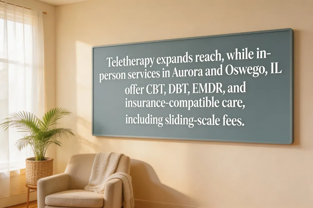 Therapy in Aurora, IL is readily available through licensed professionals offering CBT, DBT, EMDR, and trauma‑focused work for adults, teens, and families. Clinics such as Oasis Mental Health and Geode Health provide both in‑person and video sessions, covering marriage counseling, addiction treatment, and ADHD testing, plans like BlueCross BlueShield, Aetna, UnitedHealthcare, Medicare, and Medicaid are accepted.