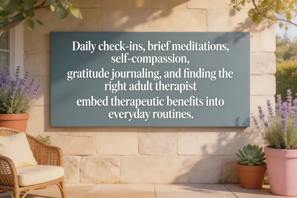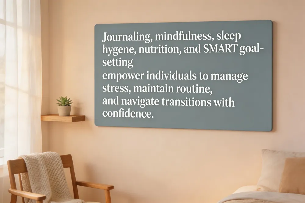 — Supportive therapy emphasizes daily structure. Simple habits such as a morning check‑in, a brief meditation, or a regular walk can anchor you during transition. Mindful breathing or a short box‑breathing exercise before stressful tasks lowers cortisol and improves emotional regulation, a technique frequently taught in CBT‑derived mindfulness therapy.