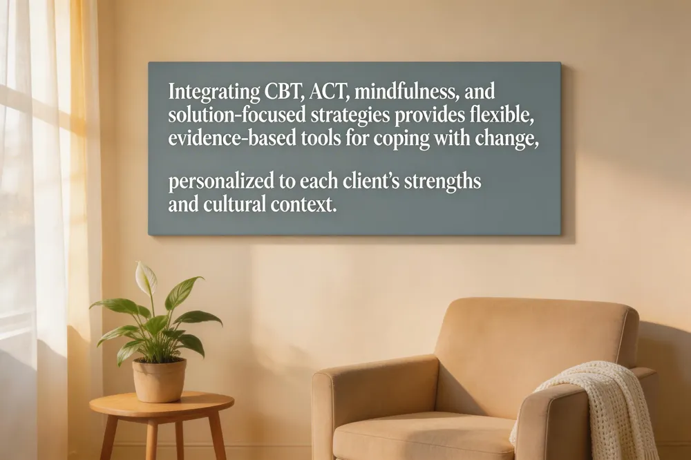 Supportive counseling blends core evidence‑based techniques—Cognitive‑Behavioral Therapy (CBT), Acceptance and Commitment Therapy (ACT), mindfulness, and solution‑focused approaches—to give clients flexible tools for life‑transition coping. CBT helps identify and reframe negative thoughts that arise during change, while ACT encourages psychological flexibility by accepting unwanted emotions and committing to values‑driven actions. Mindfulness practices, such as breathing or box‑breathing, keep clients grounded in the present moment, reducing anxiety about uncertain outcomes. Solution‑focused strategies break overwhelming events into short‑term, achievable goals, fostering a sense of control and momentum.