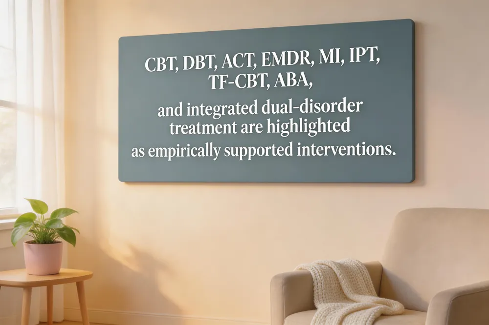 Evidence‑based therapy practices include Cognitive‑Behavioral Therapy (CBT), Dialectical Behavior Therapy (DBT), Acceptance and Commitment Therapy (ACT), and Eye Movement Desensitization and Reprocessing (EMDR). Motivational Interviewing (MI) and Interpersonal Psychotherapy (IPT) are also widely supported for adults and adolescents. For children and families, Trauma‑Focused Cognitive‑Behavioral Therapy (TF‑CBT), Applied Behavior Analysis (ABA), and Parent Management Training – Oregon (PMTO) demonstrate strong efficacy. Integrated Dual Disorder Treatment (IDDT), Peer Support Services (PSS), and Wraparound provide comprehensive, multidisciplinary approaches.