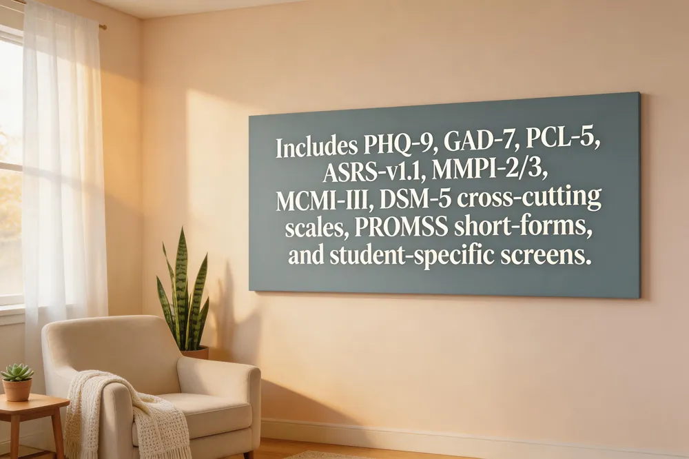 - List of mental health assessment tools: PHQ‑9, GAD‑7, PCL‑5, ASRS‑v1.1, MMPI‑2/3, MCMI‑III, SCID‑5, MINI, DSM‑5‑TR cross‑cutting measures, PROMIS scales.