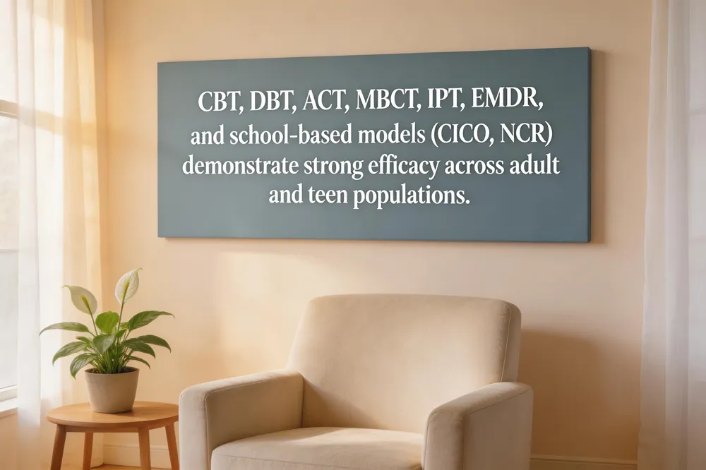 Cognitive‑Behavioral Therapy (CBT) is the frontline treatment for anxiety and depression, while Dialectical‑Behavior Therapy (DBT) is proven for self‑harm and emotion‑regulation challenges. Acceptance and Commitment Therapy (ACT) helps clients cope with chronic pain, phobias, and substance‑use concerns. Mindfulness‑Based Cognitive Therapy (MBCT) reduces recurrent depression, and Interpersonal Psychotherapy (IPT) improves depressive symptoms by strengthening relational skills. Trauma‑focused EMDR, exposure‑based protocols for specific phobias, and family‑centered attachment therapies also have strong empirical support. School‑based models such as Check‑In/Check‑Out (CICO) and Non‑Contingent Reinforcement (NCR) effectively manage externalizing behaviors in adolescents.