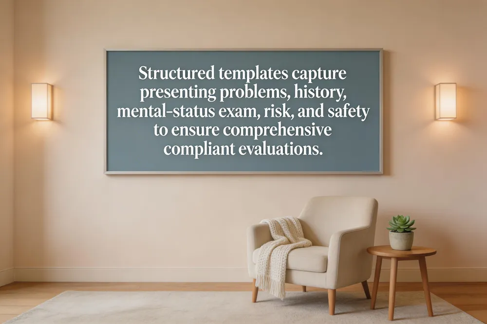 Sample PDFs and examples illustrate a complete intake package—demographics, medical history, presenting problem, mental‑status exam, safety assessment, and treatment plan. Templates demonstrate how to document appearance, mood, cognition, risk factors, diagnostic impressions, and therapist signatures, ensuring compliance with VA, APA, and insurance standards.
