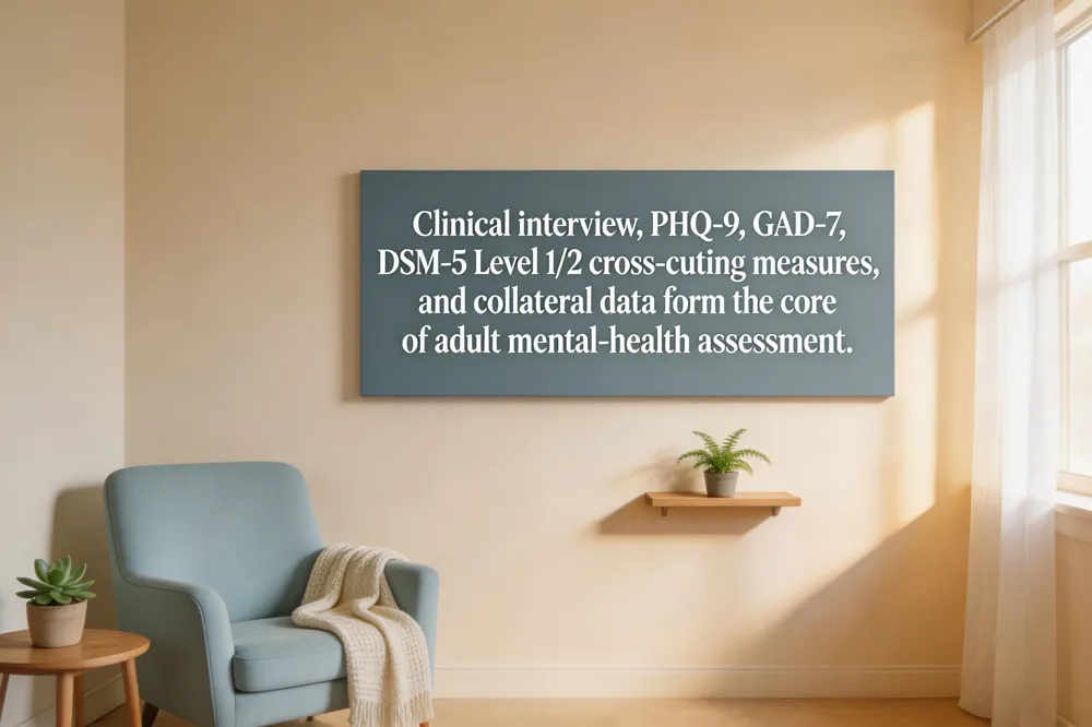 Mental health assessments for adults begin with a thorough clinical interview that explores current symptoms, medical history, functional impairment, and personal goals. Standardized self‑report questionnaires such as the PHQ‑9 for depression, GAD‑7 for anxiety, and the DSM‑5 Self‑Rated Level 1 Cross‑Cutting Symptom Measure provide quick, evidence‑based screening of core domains. For a more detailed picture, clinicians may add Level 2 cross‑cutting measures—like the PROMIS Emotional Distress‑Depression Short Form, PROMIS Sleep Disturbance Short Form, and the NIDA‑Modified ASSIST for substance use—to evaluate specific symptom clusters. Behavioral observations and, when appropriate, collateral information from family or caregivers help verify self‑report data and identify any safety concerns. Together, these tools guide diagnostic formulation and enable personalized, outcome‑focused treatment planning.