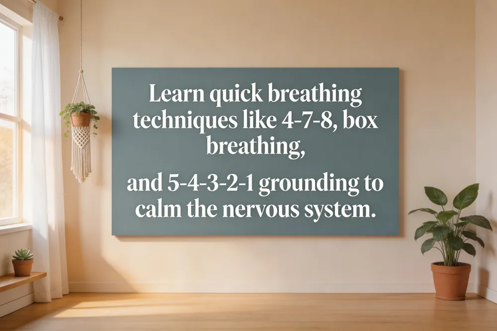 A complementary grounding tool is the 5‑4‑3‑2‑1 sensory scan: notice five things you see, four you feel, three you hear, two you smell, one you taste. This shifts focus from racing thoughts to present‑moment sensations, reinforcing the calming effect of breath.