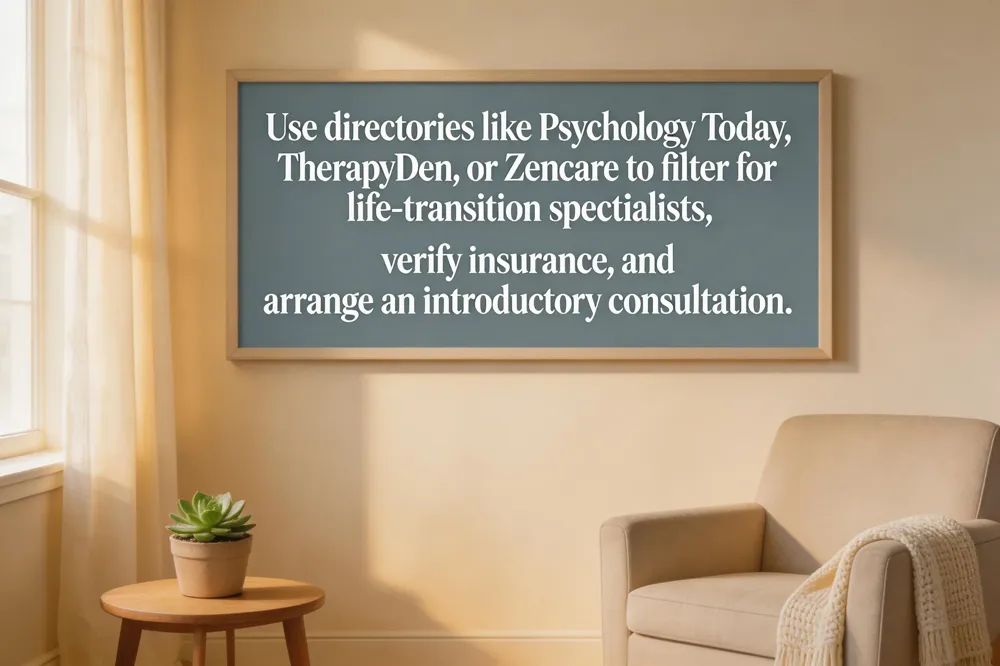 Finding a counselor who specializes in life‑transition therapy begins with reliable directories. Sites such as Psychology Today, TherapyDen, and Zencare let you filter by “life transitions” and city or zip code, showing clinicians who use evidence‑based methods like CBT, ACT, or EMDR. For local options, check nearby towns—e.g., Opp, AL—and verify insurance participation or sliding‑scale fees. Telehealth expands access; many therapists now offer video or phone sessions that fit evening or weekend schedules, allowing continuity during moves or job changes. When you contact a provider, ask about their experience with your specific transition (relocation, divorce, parenthood, etc.) and request a brief introductory call to gauge rapport. Confirm credentialing, insurance coverage, and whether a free 30‑minute consultation is available before committing to regular appointments. Ask about continuity check‑ins after the initial phase to maintain progress the year.