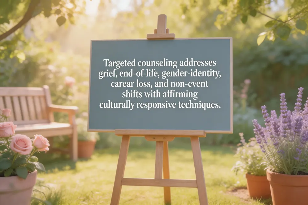 Life‑transition counseling is tailored to the unique challenges of grief, end‑of‑life, gender‑identity, and career changes. Grief and loss counseling offers a safe space to process sorrow, use narrative therapy to reauthor personal stories, and apply CBT techniques to lessen intrusive thoughts. End‑of‑life therapy blends mindfulness, legacy work, and family‑focused support to address physical decline, emotional fears, and spiritual questions, while preparing families for bereavement. Gender‑identity and non‑event transitions (when an expected change does not occur) benefit from affirming, culturally responsive care that validates identity, uses ACT to align actions with values, and builds supportive networks. Career change and unemployment counseling employs solution‑focused planning, goal‑setting, and strengths‑based coping to manage anxiety, restore confidence, and create actionable job‑search strategies.