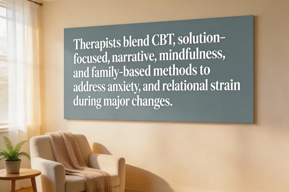 CBT helps you identify and reframe unhelpful thoughts, reducing anxiety and depressive symptoms. Solution‑focused therapy emphasizes present‑moment problem solving and concrete, actionable goals. Narrative therapy encourages you to reauthor your personal story, creating distance from challenges and fostering agency. Mindfulness‑based interventions, such as meditation and breath work, lower cortisol and improve emotional regulation. Family therapy and Emotionally focused therapy address shifting relational dynamics, improving communication and attachment during transitions like divorce or becoming a parent.