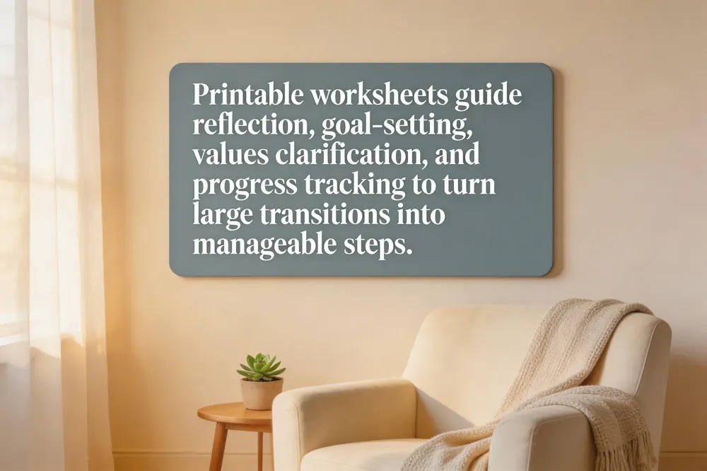 Life‑transitions therapy worksheets are structured tools that help clients navigate major changes such as a new job, relocation, or a life‑stage shift. They typically combine reflective journaling with exercises for goal‑setting, values clarification, and stress‑management to build resilience and focus. Many worksheets guide users through acknowledging emotions, identifying strengths and resources, and breaking the transition into small, achievable steps. Some also incorporate the Stages of Change model, prompting clients to recognize their current stage (e.g., contemplation or preparation) and select appropriate coping strategies. By providing a clear, printable format, these worksheets enable clients to track progress, stay motivated, and integrate self‑care practices throughout the transition. Goals are set by first clarifying core values, then translating those values into specific, measurable objectives that align with the client’s vision for the new chapter. Progress is tracked through regular check‑ins, symptom logs, and self‑care reminders, ensuring that clients see tangible growth and maintain momentum as they move from the “letting‑go” phase to a new beginning.