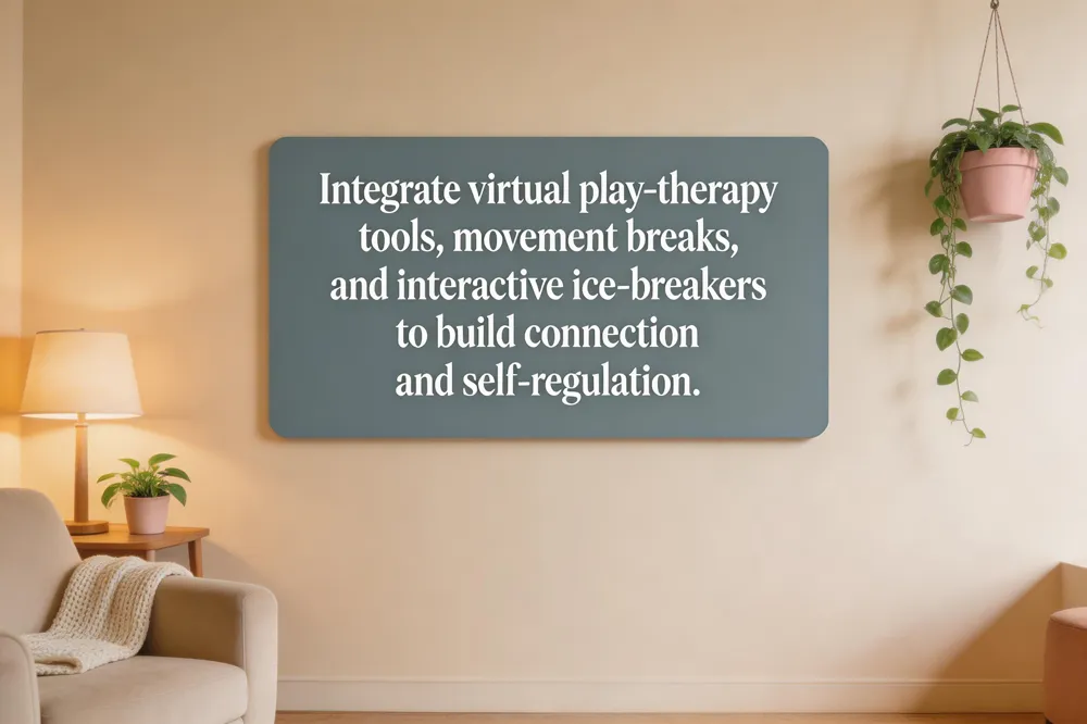 Interactive ice‑breakers such as a quick virtual scavenger hunt or “All About Me” show‑and‑tell let children move around their space, pick an item that matters to them, and share it with the therapist, creating instant connection. Collaborative digital tools like shared drawing boards or virtual whiteboards enable the child and therapist to co‑create pictures, trees, or e‑maps, fostering teamwork and giving visual cues for discussion. Playful games—rock‑paper‑scissors where the winner asks a light‑hearted question, or a brief “Simon Says” style mindfulness activity—inject fun while encouraging attention and regulation. Incorporating a favorite stuffed animal or puppet as a “talking buddy” gives the child a tangible ally and helps them feel safe expressing emotions through the screen. Finally, using bright, child‑friendly virtual backdrops or wearing a silly hat adds a sense of playfulness that signals warmth and empathy, strengthening therapeutic rapport.