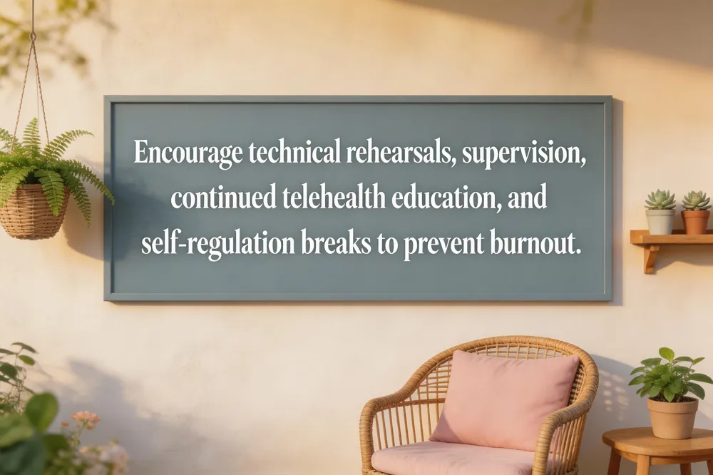 Maintaining competence in telehealth platforms begins with regular technical rehearsals: testing internet speed, video and audio settings, and backup phone options before each session (APA, Telehealth for Kids). Clinicians should schedule monthly supervision or peer‑consultation meetings to reflect on case challenges, especially those involving trauma‑informed play or safety planning for children who have witnessed violence (Child Witness to Violence Project). Ongoing professional development—such as completing the AMA‑approved Telemental Health with Kids Toolbox or attending state‑mandated APA telepsychology workshops—helps therapists stay aligned with evolving HIPAA‑compliant security standards and state licensure rules (APA Guidelines 2024). To prevent burnout, therapists are encouraged to embed brief movement breaks, practice grounding techniques, and set clear work‑life boundaries, mirroring the self‑regulation strategies they teach their child clients.