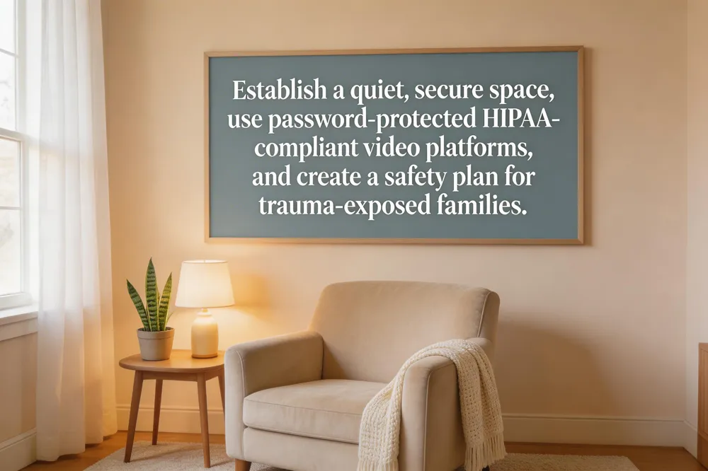 Creating a safe, private space is the foundation of successful child telehealth. Choose a quiet room where the child can close the door, use a neutral background, and keep comfort objects (a stuffed animal, blanket) nearby. Discuss safety openly with the caregiver, especially if there is a history of domestic or community violence, and establish a private emergency plan. Technical readiness is equally essential: verify a password‑protected, high‑speed internet connection, test the video platform, and have a backup plan such as a phone call or text if the video drops. Involve parents from the start—explain session length (30‑45 minutes for younger children), set expectations for screen time, and coach them on how to support the child’s emotional regulation during the session. This collaborative, well‑prepared approach promotes trust, reduces interruptions, and maximizes therapeutic impact.