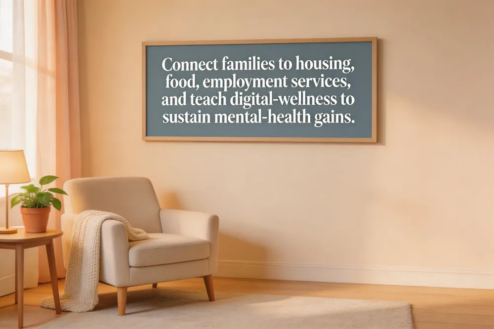 Effective pediatric telehealth goes beyond the virtual session by connecting families to the broader resources they need to thrive. Clinicians should assess a child's ecosystem and, when housing instability, food insecurity, or unemployment are identified, provide concrete referrals to local shelters, food banks, and job‑training programs, often through coordinated case‑management or social‑work partners. At the same time, integrating digital‑wellness education—teaching children and caregivers safe‑online habits, screen‑time limits, and cyber‑bullying prevention—reinforces mental‑health gains and reduces stressors associated with technology use. Finally, therapists should collaborate with schools, after‑school programs, and community agencies, sharing relevant information (with consent) to align therapeutic goals with academic supports, extracurricular activities, and community‑based services, creating a seamless safety that sustains progress outside the screen.