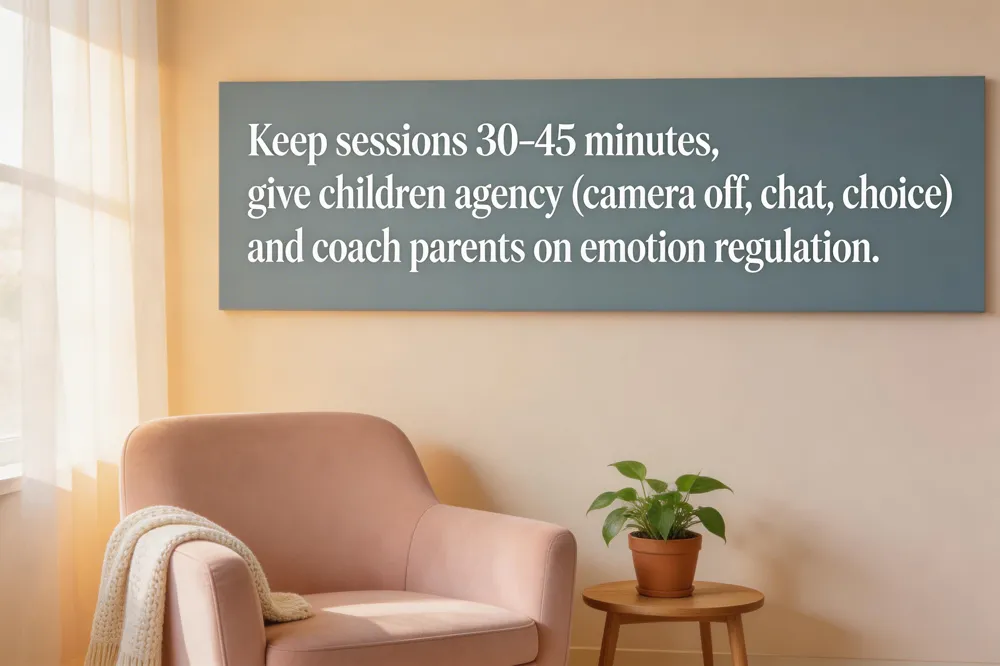 Key take‑aways for families and clinicians: Successful child telehealth hinges on a private, well‑lit space, reliable password‑protected internet, and age‑appropriate supplies (toys, art materials, movement props). Sessions for younger children should be 30‑45 minutes, include frequent movement breaks, and give the child agency to mute the camera or use chat. Clinicians must discuss safety privately with caregivers, obtain documented parental consent, verify the child’s location at each session, and have a backup phone plan. Concrete parent coaching on emotion‑regulation strategies is essential because the therapist cannot intervene physically.