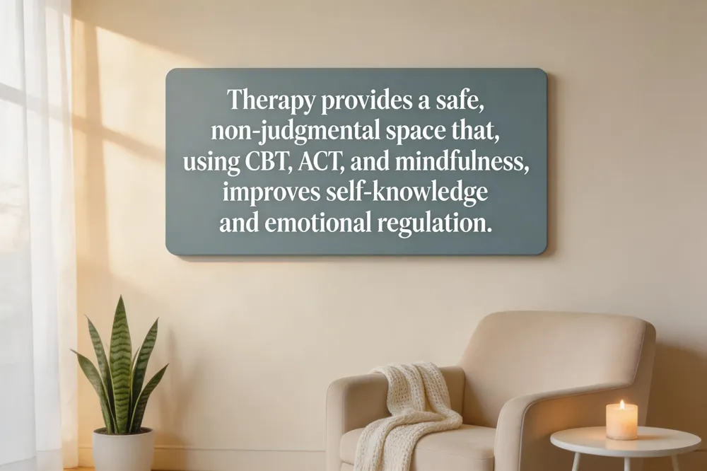 Therapy creates a safe, non‑judgmental space where you can pause, reflect, and uncover the thoughts, emotions, and patterns that shape your life. By identifying recurring emotional triggers—such as conflict avoidance or over‑responsibility—you gain the insight needed to set healthier boundaries, improve communication, and boost self‑esteem. Evidence‑based approaches like CBT, ACT, and mindfulness‑based stress reduction have been proven to increase self‑awareness, reduce anxiety, and foster emotional resilience.