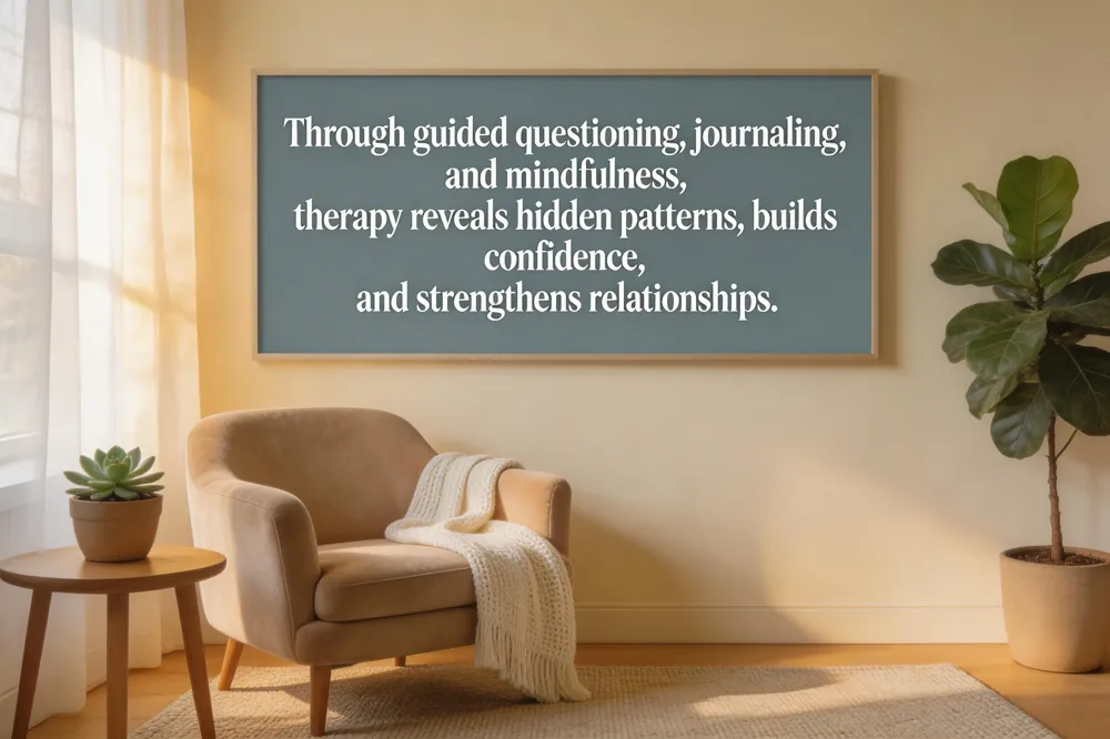 Cognitive‑behavioral therapy (CBT) uses a simple, three‑step framework—Catching, Checking, and Changing to turn unhelpful thinking into healthier patterns. Catching thoughts means pausing in the moment to notice a negative or automatic belief as it arises, a skill cultivated in the safe, non‑judgmental space that therapy provides. Checking evidence invites clients to examine the thought’s accuracy by asking for concrete proof, questioning assumptions, and separating facts from cognitive distortions such as all‑or‑nothing thinking. This evidence‑based step reduces anxiety and improves self‑esteem, as shown in numerous studies of CBT and related techniques. Changing patterns is the final step: clients replace the distorted belief with a balanced, realistic alternative and practice new coping behaviors, strengthening emotional resilience and communication skills. By repeatedly applying the 3 C’s, individuals gain self‑awareness, set clearer personal goals, and develop lasting confidence in their ability to manage stress and relationships.