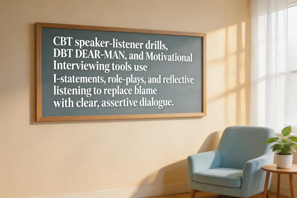 Therapeutic communication blends evidence‑based techniques to turn conflict into growth. In Cognitive‑Behavioral Therapy, communication drills such as the speaker‑listener method, thought‑recording, and assertiveness role‑plays help clients replace blame with clear "I" statements and active listening (Wachtel, 2011; Overall et al., 2016). Dialectical Behavior Therapy adds interpersonal‑effectiveness tools—DEAR‑MAN for request‑making and validation skills that reduce emotional flooding and promote collaborative problem‑solving (Linehan, 2020). Motivational Interviewing contributes a compassionate, non‑judgmental stance, using open‑ended questions and reflective listening to explore ambivalence and strengthen commitment to change (Miller & Rollnick, 2013).