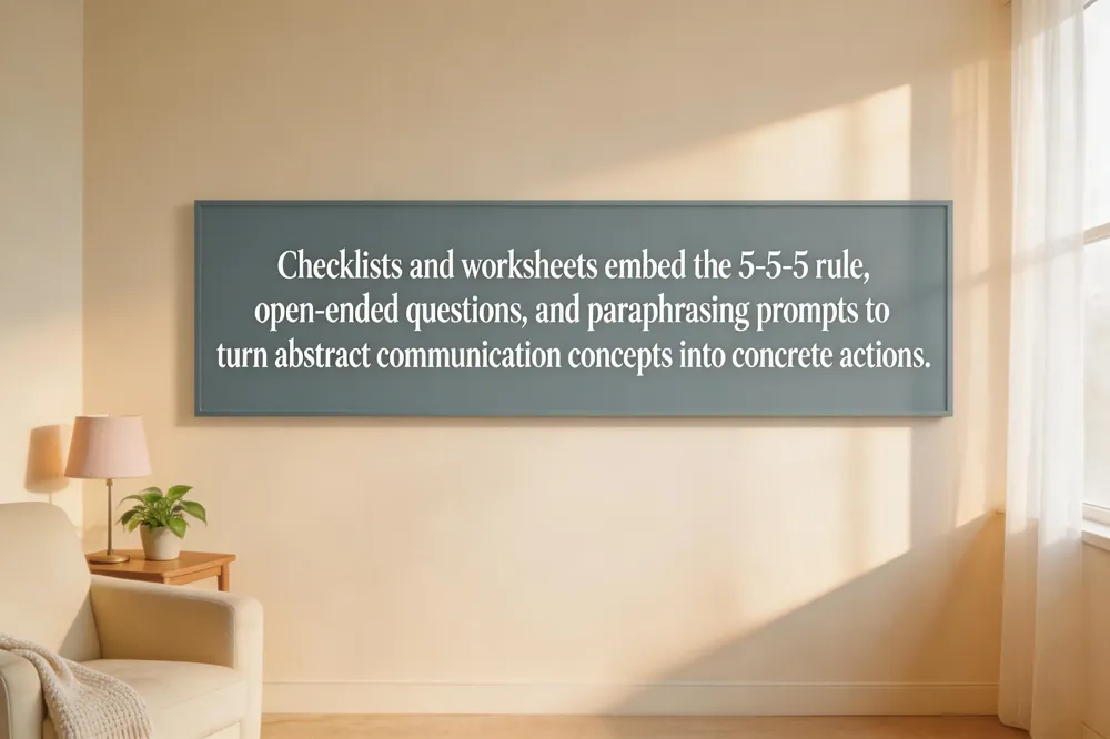 5‑5‑5 rule and worksheet usage Therapy worksheets embed the rule in grids for active‑listening, emotion‑labeling, and role‑play prompts. Clients fill in the grid after each interaction, tracking progress and reinforcing evidence‑based skills. These tools turn abstract communication concepts into concrete, repeatable actions, fostering confidence and healthier dialogue.