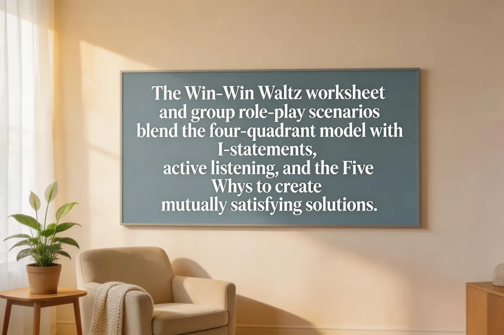 Effective conflict work blends the four‑quadrant communication model (direct‑vs‑cooperation, opposition‑vs‑cooperation) with therapeutic tools such as acceptance, active listening, and I‑statements. For couples, a “Conflict Resolution for Couples” PDF begins by normalizing disagreement, then guides partners through a I‑statement script (“I feel ___ when ___ because ___”) and the Win‑Win Waltz worksheet: (1) state positions, (2) explore underlying concerns, (3) co‑create a mutually satisfactory plan. Group therapy adds role‑play scenarios and problem‑solving circles where participants practice de‑escalation, use the “Orange” negotiation game, and apply the “Five Whys” to uncover interests. Printable adult activity PDFs offer anger‑trigger maps, collaborative brainstorming sheets, and grounding drills to reduce physiological arousal before dialogue. Therapists model these skills by reflecting, summarizing, and validating emotions, while checking non‑verbal cues and offering strategic silence. Together, these evidence‑based techniques turn conflict into a catalyst for deeper empathy, clearer communication, and lasting relational resilience.